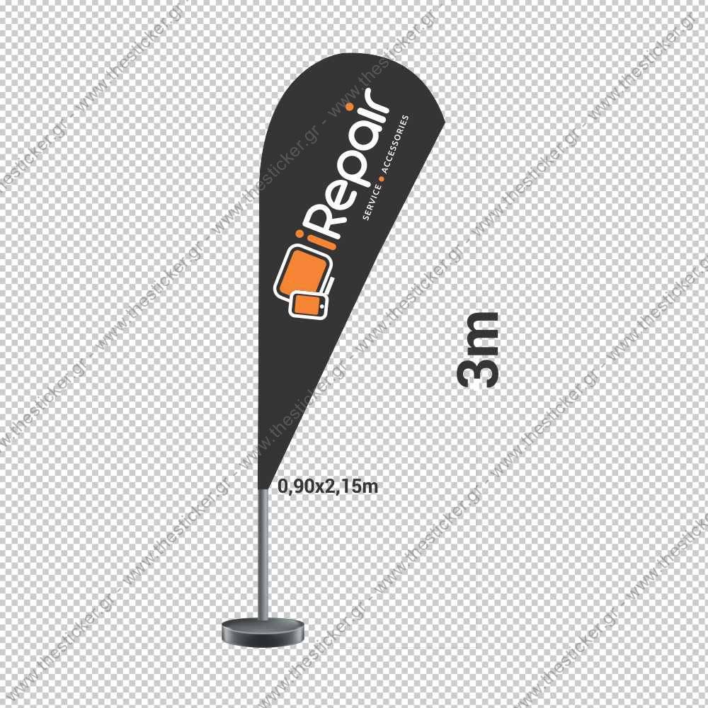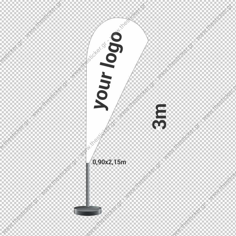 Διαφημιστική επιδαπέδια σημαία πεζοδρομίου συνολικού ύψους 3m, τύπου “δάκρυ”, με μεταλλικό ιστό. Διαθέτει ελκυστική σχεδίαση και είναι εύκολη στη συναρμολόγηση. Με εξαιρετικό αποτέλεσμα στην ποιότητα και την τελική εικόνα της εκτύπωσης σε ειδικό υλικό από σημαιόπανο. Δυνατότητα επιλογής βάσης στήριξης μεταξύ πλαστικής νερού(προεπιλεγμένη), μπετού ή μεταλλική βαρέως τύπου. Κατάλληλη για εσωτερικούς και εξωτερικούς χώρους.
